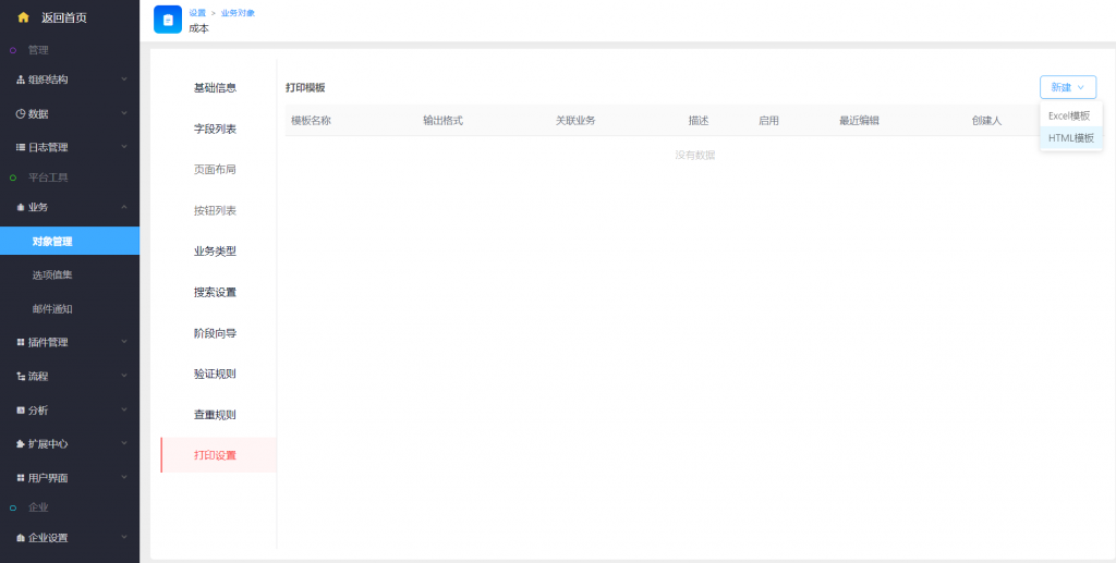 - 配置和普通excel模板打印設(shè)置在一起,路徑為:系統(tǒng)設(shè)置——業(yè)務(wù)——對(duì)象管理——打印設(shè)置。