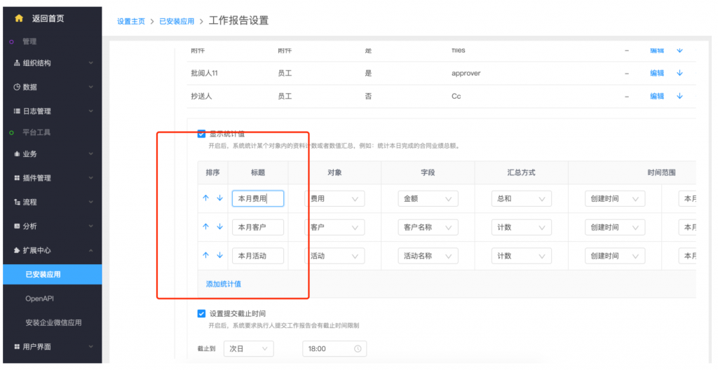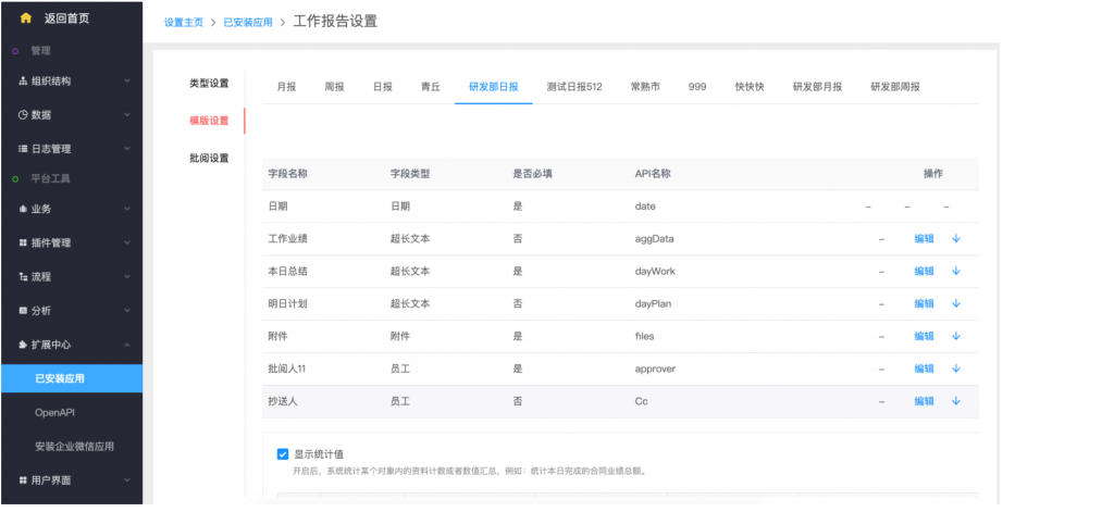 - 后臺(tái)設(shè)置:系統(tǒng)設(shè)置——擴(kuò)展中心——已安裝應(yīng)用——工作報(bào)告,類型設(shè)置支持新建類型;在模板設(shè)置中,可以按業(yè)務(wù)類型設(shè)置不同的字段和統(tǒng)計(jì)值;統(tǒng)計(jì)值設(shè)置,支持自定義名稱;