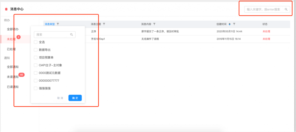 - 消息通知的類型和主題進(jìn)行了規(guī)范,便于進(jìn)行分類和篩選;每條消息可明確看到業(yè)務(wù)來(lái)源,主題更加清晰,大幅度減少了以“通知”為標(biāo)題的消息;同時(shí)查看或處理變?yōu)檎锌牲c(diǎn)擊;消息支持篩選和搜索,也可以直接搜索內(nèi)容或主題;待辦和通知的狀態(tài)變化更加智能,去除了手動(dòng)按鈕操作,當(dāng)處理或查看詳情后,狀態(tài)會(huì)自動(dòng)變化;同時(shí)優(yōu)化了紅點(diǎn)顯示數(shù)量的刷新機(jī)制,更新更及時(shí).