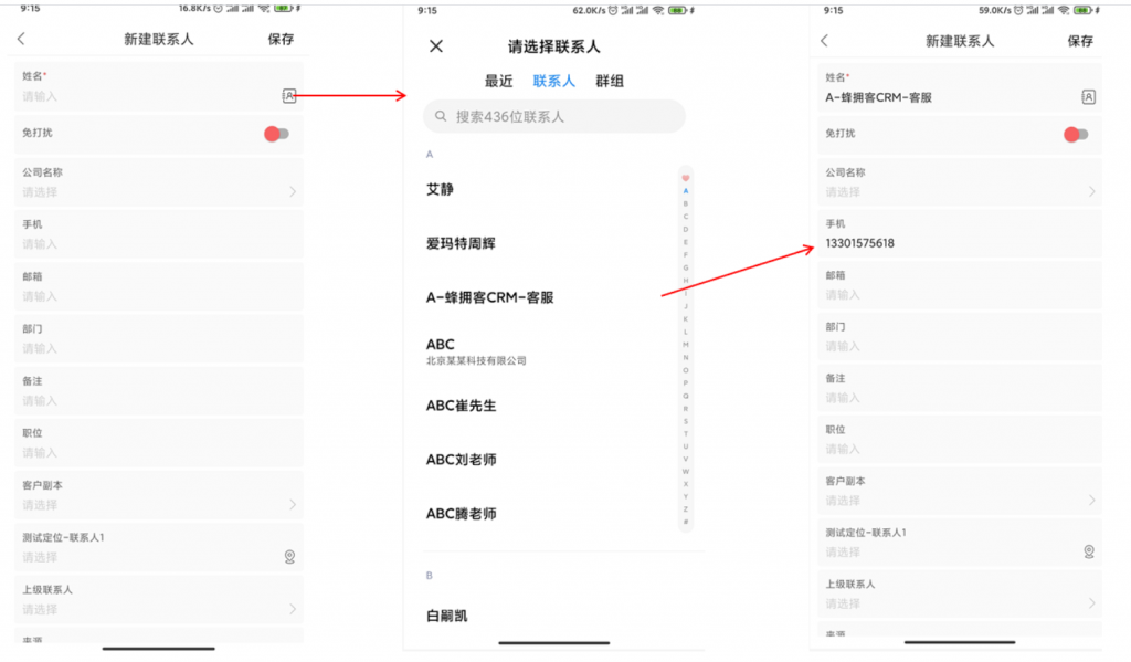 3) 手機(jī)端新建聯(lián)系人可以通過(guò)手機(jī)通訊錄選擇。