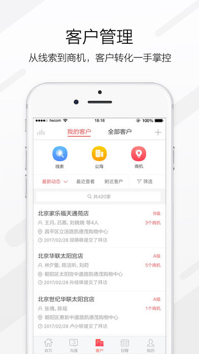 隨時隨地錄入銷售線索,拓展商業機會,高效管理從各個渠道而來的線索信息,實現客戶信息的的沉淀,讓銷售資源企業化,并分配給最合適的銷售人員,從而產生更多訂單。