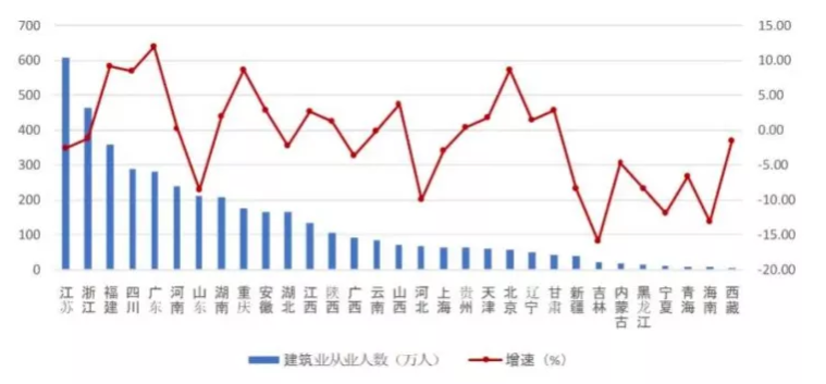 圖5 2021年上半年各地區(qū)建筑業(yè)從業(yè)人數(shù)及其增長情況