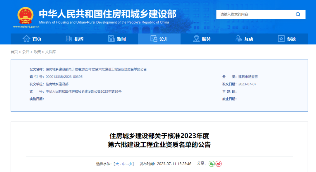 7月11日,住建部發(fā)布關于核準2023年度第六批建設工程企業(yè)資質名單的公告,其中16家建筑業(yè)企業(yè)“升特”: