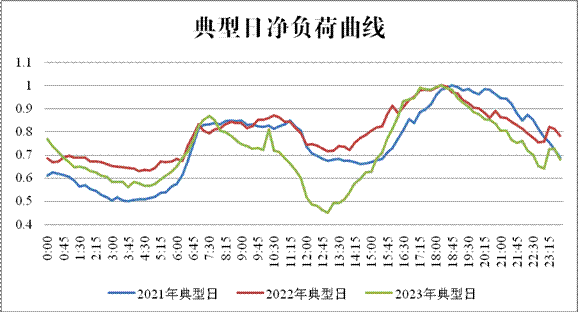 由于湖南光伏發(fā)電裝機(jī)的快速增長,湖南電網(wǎng)凈負(fù)荷曲線(電網(wǎng)凈負(fù)荷=電網(wǎng)負(fù)荷-新能源出力-外受電)產(chǎn)生向“鴨子型曲線”轉(zhuǎn)變的趨勢(見圖),午間腰荷時段凈負(fù)荷越來越低,該時段可再生能源消納困難情況開始顯現(xiàn)。以2023年某日為例,該日光伏發(fā)電出力較大,腰荷時段電網(wǎng)凈負(fù)荷較前兩年同期明顯下降,同時低于當(dāng)日低谷時段凈負(fù)荷,導(dǎo)致腰荷時段新能源消納更為困難。