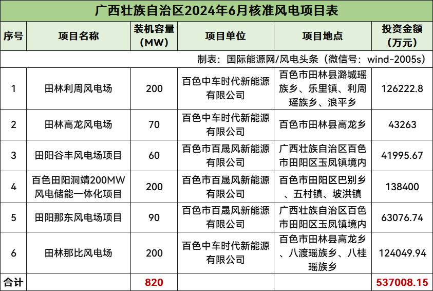 廣西核準6個風電項目,總規(guī)模820MW,總投資537008.15萬元,均為陸上風電項目。