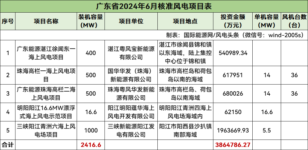 廣東核準5個風電項目,總規(guī)模2416.6MW,總投資3864786.27萬元,均為海上風電項目。