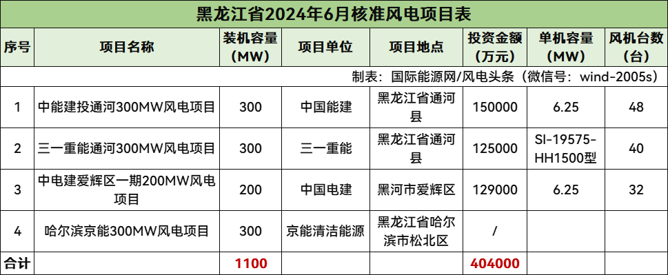 黑龍江核準4個風電項目,總規(guī)模1100MW,總投資404000萬元,均為陸上風電項目。