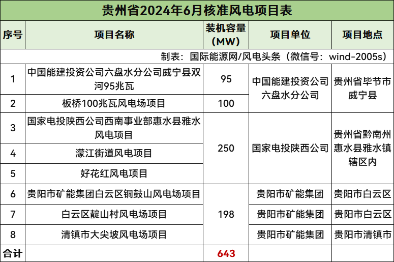 貴州核準8個風電項目,總規(guī)模643MW,均為陸上風電項目。