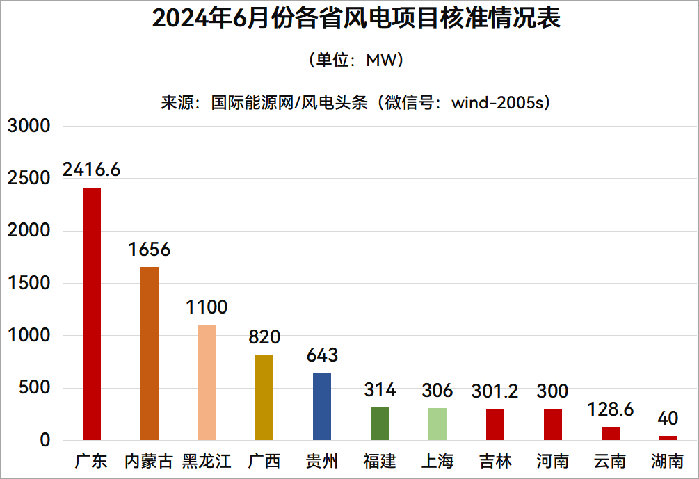 2024年6月風電項目獲核準的省份分別是廣東、內(nèi)蒙古、黑龍江、廣西、貴州、福建、上海、吉林、河南、云南、湖南等11個省份。