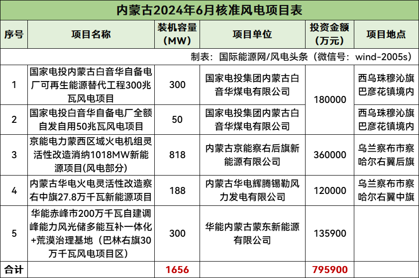 內(nèi)蒙古核準5個風電項目,總規(guī)模1656MW,總投資795900萬元,均為陸上風電項目。