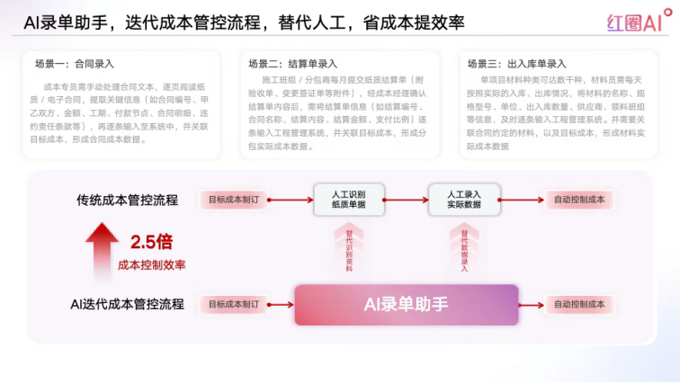 面對(duì)這些困境,工程企業(yè)需要的不是 “零散的數(shù)字化工具”,而是一套能打通數(shù)據(jù)、沉淀知識(shí)、賦能決策的完整解決方案。紅圈工程管理系統(tǒng)以 “數(shù)據(jù)驅(qū)動(dòng)、AI 賦能決策” 為核心理念構(gòu)建的 “智慧工程大腦”,正是為破解這些難題而來(lái)。