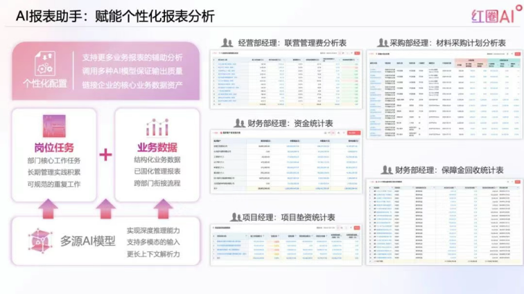 過(guò)去,財(cái)務(wù)、經(jīng)營(yíng)、項(xiàng)目等部門(mén)要花幾天時(shí)間做報(bào)表,結(jié)果還只是 “數(shù)據(jù)的堆砌”;現(xiàn)在,AI 報(bào)表助手能自動(dòng)生成多維度管理報(bào)表,比如材料采購(gòu)計(jì)劃分析、項(xiàng)目墊資統(tǒng)計(jì)、聯(lián)營(yíng)管理費(fèi)分析等,還能自定義配置報(bào)表維度,滿(mǎn)足不同崗位的需求。更進(jìn)階的是 “項(xiàng)目 360°AI 解讀”:系統(tǒng)會(huì)綜合項(xiàng)目的進(jìn)度、成本、質(zhì)量、安全數(shù)據(jù),自動(dòng)對(duì)比目標(biāo)與實(shí)際的差異 —— 比如發(fā)現(xiàn)某項(xiàng)目成本超支,會(huì)精準(zhǔn)定位是 “材料價(jià)格上漲” 還是 “用量超標(biāo)”;還能預(yù)警潛在風(fēng)險(xiǎn),比如 “某項(xiàng)目進(jìn)度滯后可能影響現(xiàn)金流”,并給出調(diào)整建議。