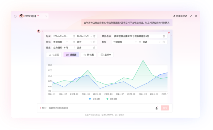 在具體應用中,BOSS助理可快速鎖定數(shù)據(jù),例如查詢“張偉昨天提交的審批”,AI通過意圖識別下發(fā)指令,系統(tǒng)在判斷權(quán)限后返回列表,精準調(diào)取對應審批,實現(xiàn)急事優(yōu)先快速處理。此外,它還能響應諸如“查看高碑店項目各供應商支付情況”的復雜查詢,直接呈現(xiàn)合同金額、結(jié)算金額、支付金額等關(guān)鍵指標,幫助管理者快速發(fā)現(xiàn)異常并追溯源頭。