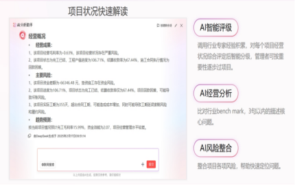 而紅圈AI的加入,則將這種可視化升級為“可解讀”、“可對話”的智能洞察。 想象一下,你不再需要費力地閱讀圖表,而是可以直接向你的“BOSS 助理Agent”提問:“小王,這個月公司現金流怎么樣?哪個項目成本超支最嚴重?”。這位BOSS 助理Agent能借助大模型的推理能力,精準挖掘企業自有數據模型,用自然語言向你匯報全面、準確的經營數據,甚至能主動指出異常和風險點,讓洞悉經營狀況變得像聊天一樣簡單。更進一步。紅圈AI的“項目360°AI解讀”,能整合資金、成本、合同、付款等全維經營指標,一鍵生成項目的全景“作戰圖”。 不再只是展示數據,更能通過大模型深度解讀數據背后的經營風險與應對策略,將復雜的專業數據轉化為管理者一眼就能看懂的決策語言,真正讓管理全局盡在掌握。這能幫助解決傳統經營會議中因會前準備不足、數據錯漏導致的效率低下問題。