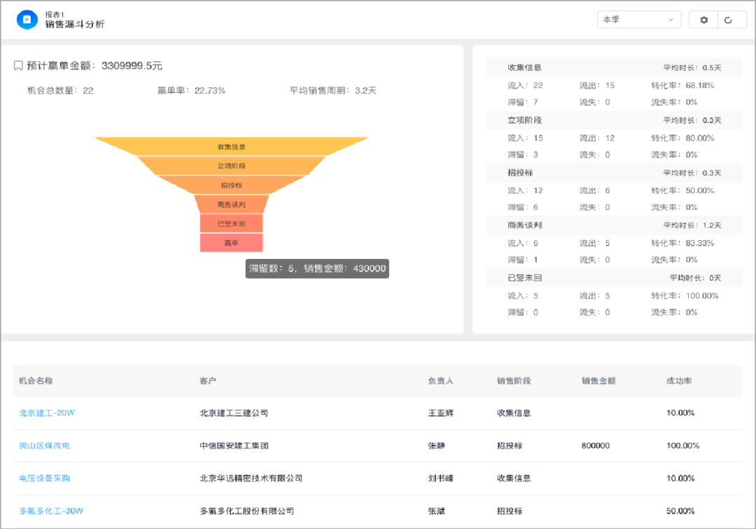 ○ 商機(jī)管理模塊(項(xiàng)目迷霧一掃光): 為公司構(gòu)建項(xiàng)目商機(jī)推進(jìn)轉(zhuǎn)化漏斗,清晰展示各階段項(xiàng)目數(shù)量及分布,幫助管理層快速鎖定需重點(diǎn)關(guān)注的商機(jī),合理調(diào)配資源,加速項(xiàng)目轉(zhuǎn)化。