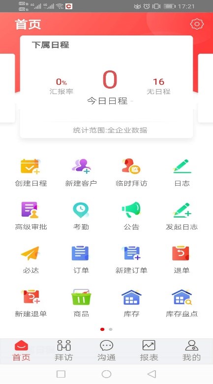 登陸后,下方為主要的操作按鈕:首頁、拜訪、溝通、報表、我的。首頁為主要的功能模塊,可以通過右上角的設置(齒輪按鈕)來進行模塊調(diào)整;